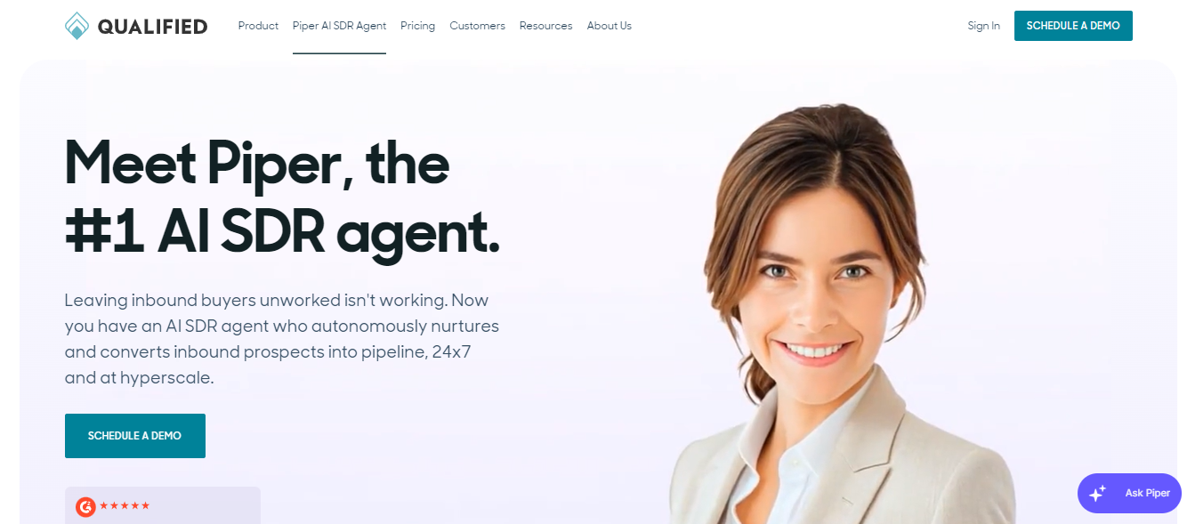 - Piper, Qualified’s AI SDR agent, engages website visitors in natural, on-brand conversations, qualifies leads, and routes high-intent prospects directly to sales reps.