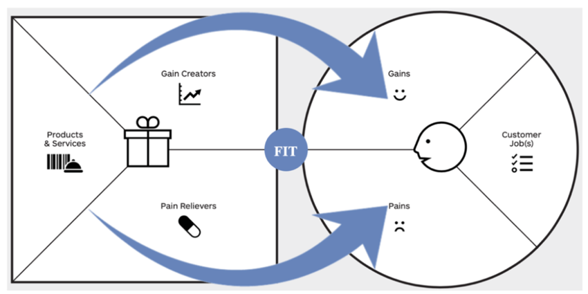 Built around two sides: the customer profile (jobs, pains, gains) and the value map (gain creators, pain relievers, products/services). The goal is alignment between what the customer cares about and what you actually offer.