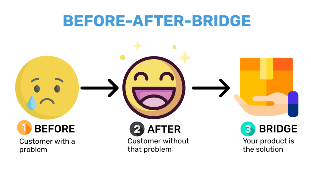 Describe the painful "before" state your prospect is living in. Describe the desirable "after" state. Position your product or service as the bridge between the two.