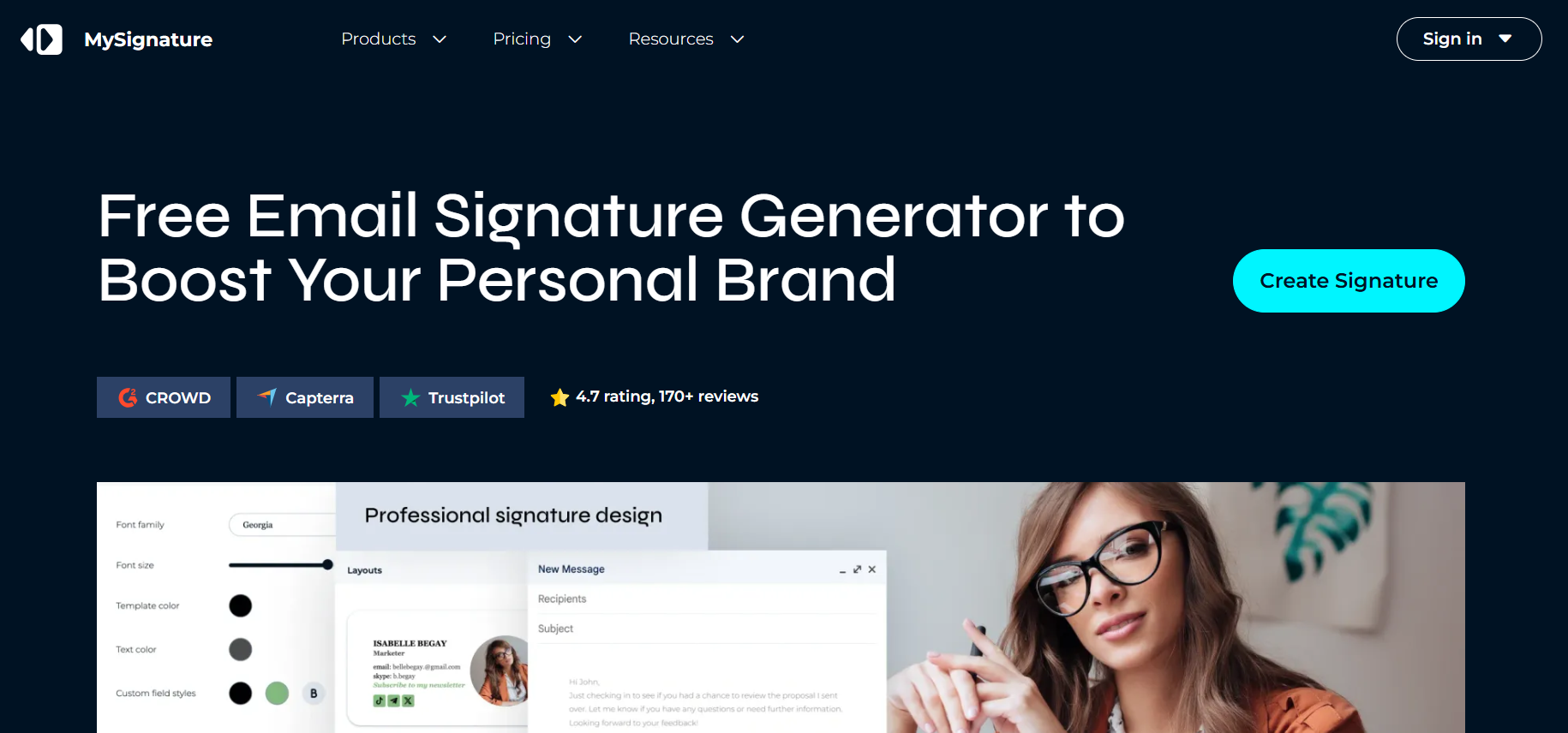 MySignature is the go-to free email signature generator for individual professionals and small teams who need a polished result without paying enterprise-level prices. Plans start at $4 per month per signature, and there's also a free version with basic features.