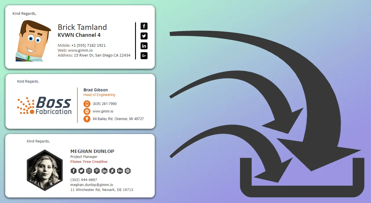 Gimmio (formerly ZippySig) is the most flexible business email signature generator on this list in terms of raw customization. It's a web-based tool that helps businesses design HTML signatures using styling options for fonts, social icons, spacing, images, borders, and banners — and lets marketing agencies bulk import customer details via CSV, Excel, or Active Directory.