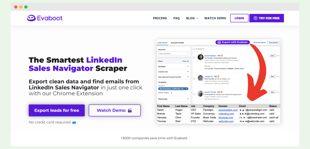 Evaboot is a LinkedIn data enrichment tool built specifically for Sales Navigator users. Its core job is simple but incredibly valuable: it takes your Sales Navigator search results, cleans the data, verifies the leads against your actual search filters, and exports a ready-to-use prospect list.
