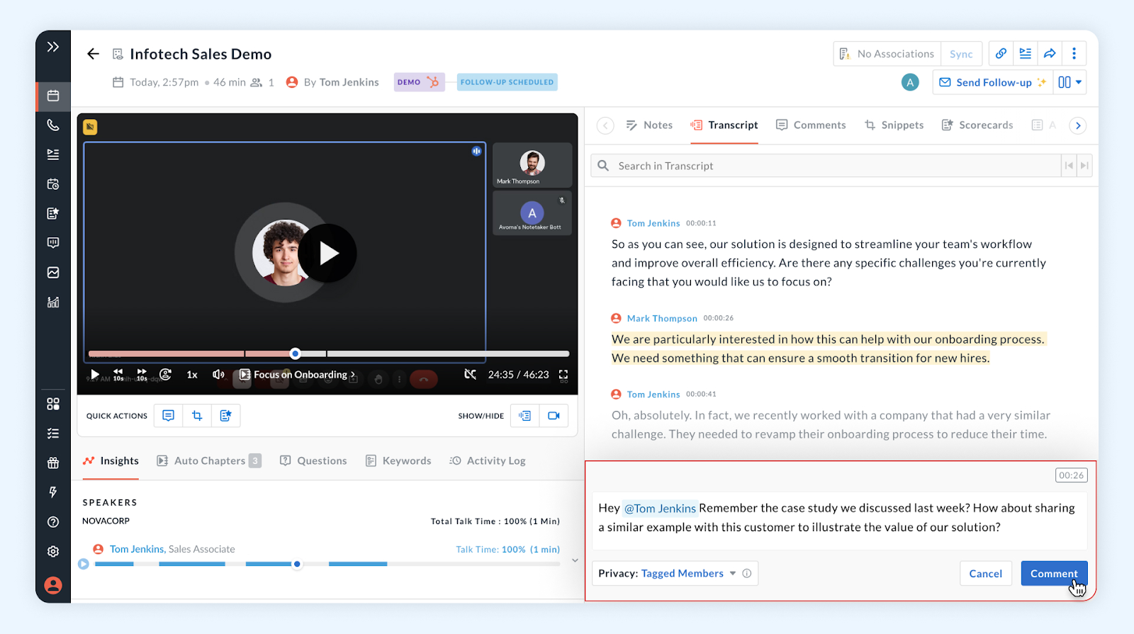 - Smart search with filters for sentiment, speaker talk time, and key topics.
