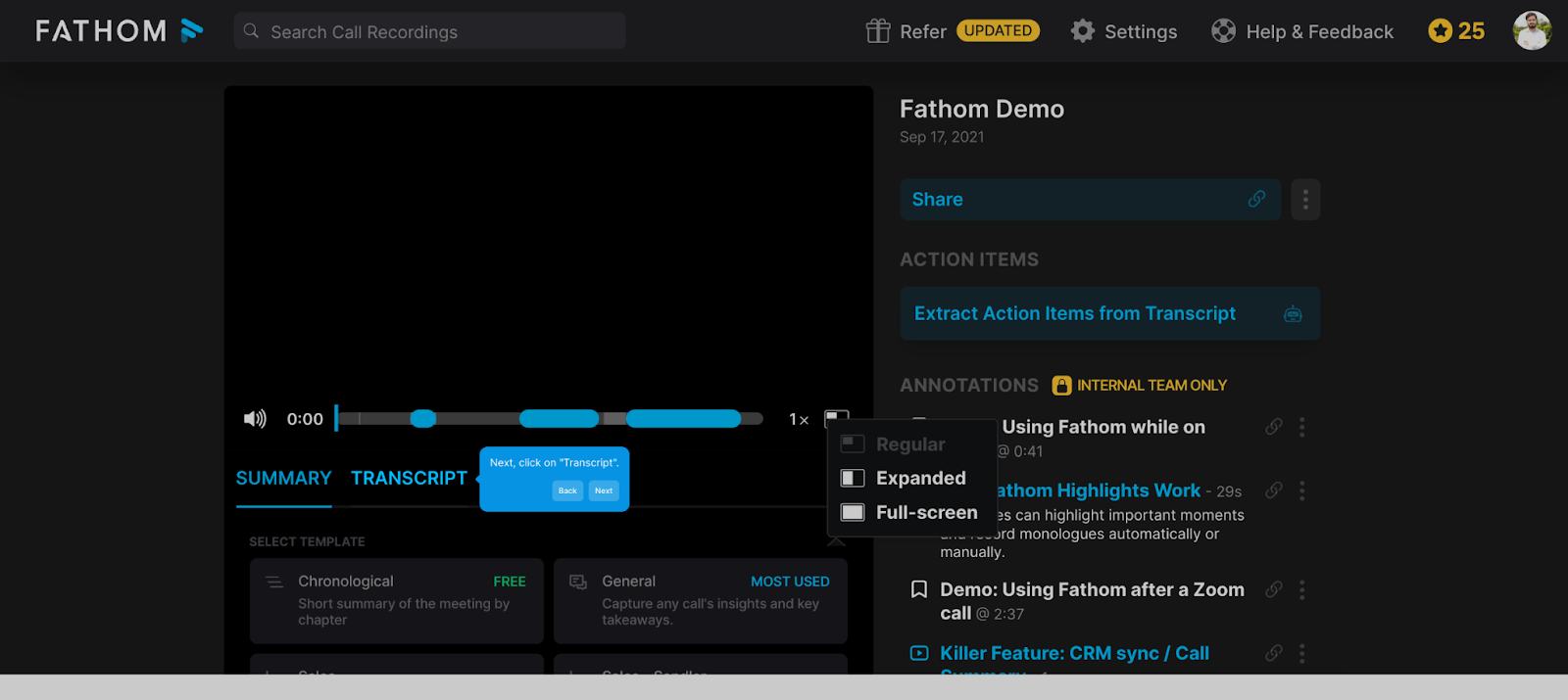 - "Ask Fathom" AI assistant to query past meetings, find specific details, or draft follow-up emails.