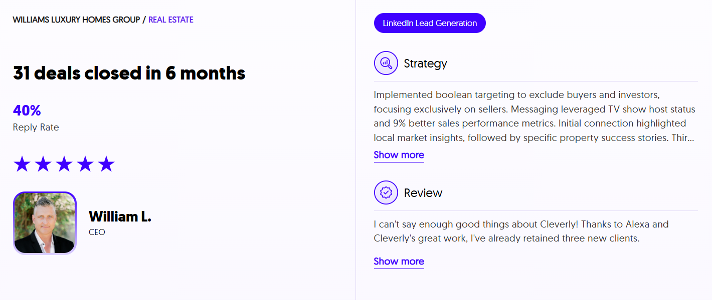 That's exactly where Cleverly comes in. We're the highest-rated done-for-you B2B lead generation agency, and we work with CRE companies that need a systematic outbound engine without hiring and managing an SDR team.