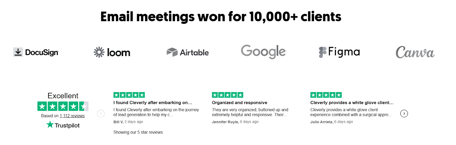 Cleverly is a performance-based email campaign company that's worked with over 10,000 clients including Amazon, Google, Uber, PayPal, Slack, and Spotify. We have generated $312 million in pipeline revenue and $51.2 million in closed revenue using a unique pay-per-meeting-ready-lead model.