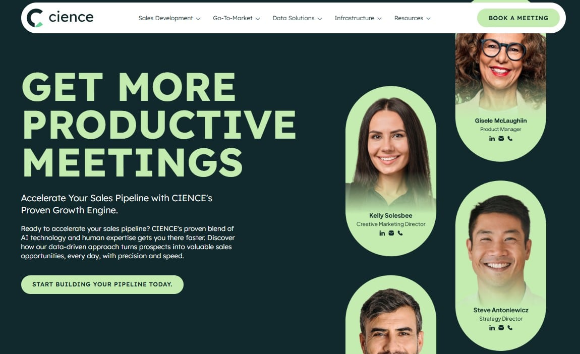 CIENCE is a B2B lead generation and sales acceleration company that combines AI-powered technology with human SDRs to run multi-channel outbound campaigns. They act as an outsourced sales department, managing the entire prospecting process from data to outreach.