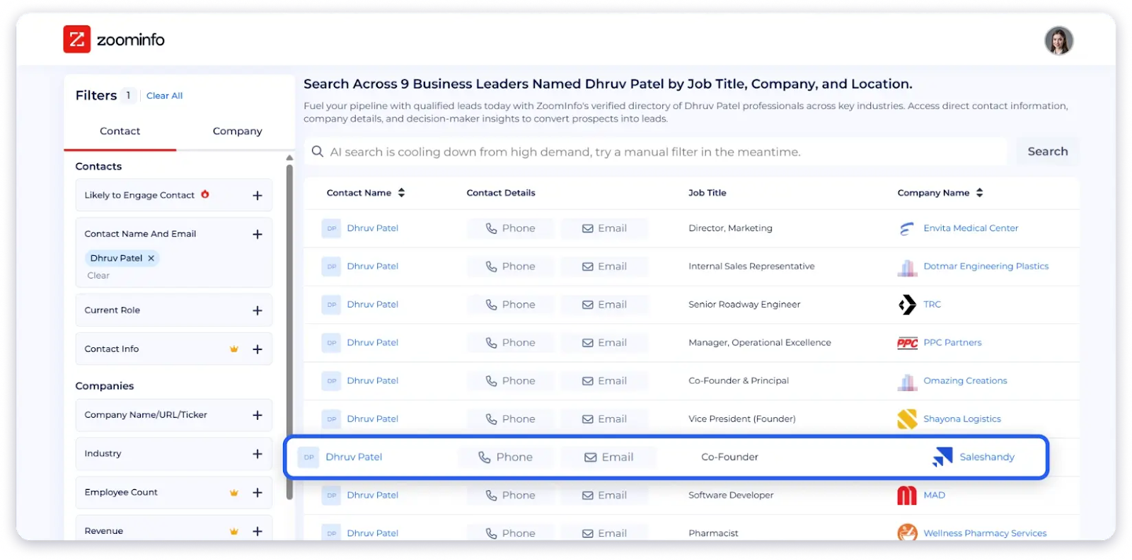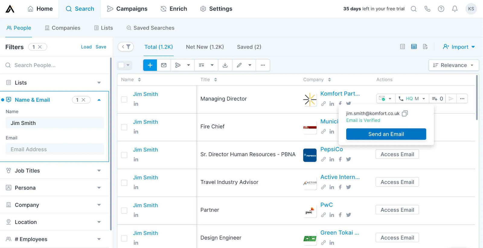 - Building targeted prospect lists — filter by job title, industry, company size, location, and more to build lists of your exact ICP, not just random contacts.