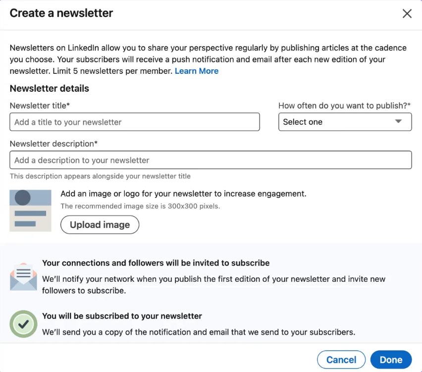Think of a LinkedIn newsletter as your own mini publication inside LinkedIn. It lets you share valuable insights, updates, and resources with your followers, and every time you publish, LinkedIn notifies your subscribers by email and in-app, driving high visibility right away.
