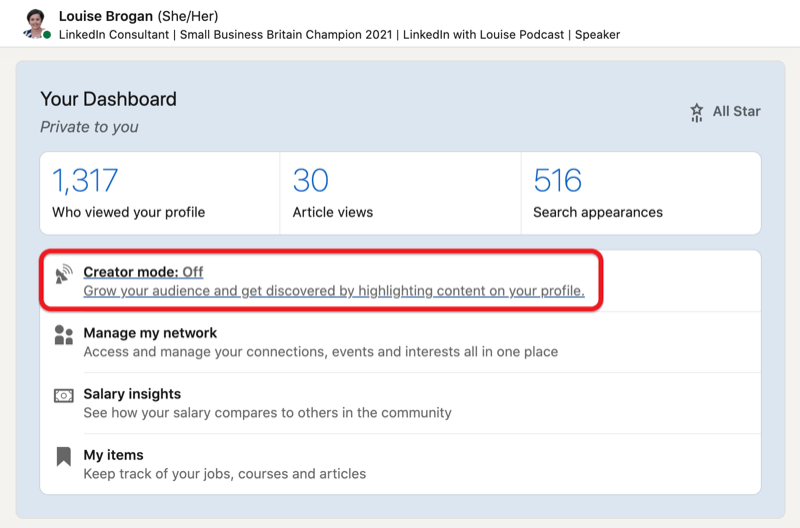 - Go to your LinkedIn profile → scroll to “Resources” → click “Creator Mode: Off.”
