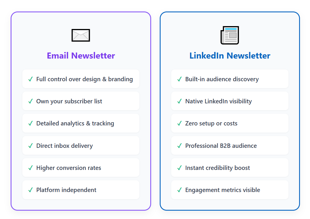 When deciding between a LinkedIn newsletter vs email newsletter, it helps to understand the strengths and limitations of each. Both can be powerful, but they serve slightly different purposes.