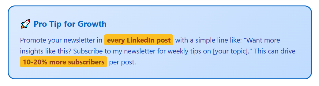 - Promoting your newsletter across your profile, posts, groups, and other channels drives subscriber growth.