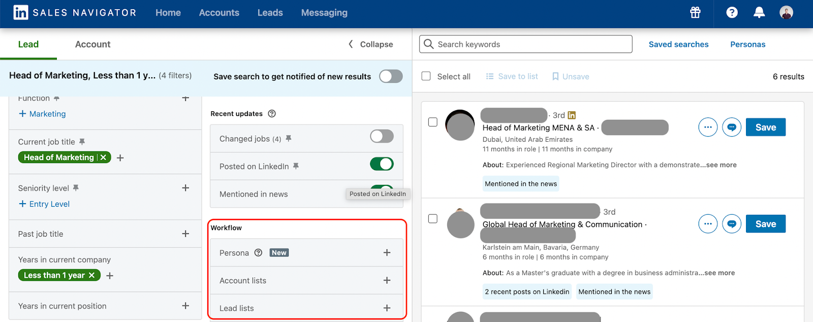 - Lead saving and account tracking — save prospects into lists and get notified when they change roles or post content.