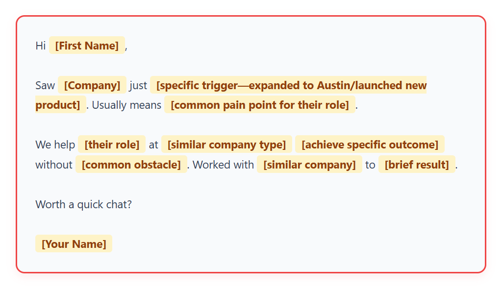 4. Short social proof (optional, 1 sentence) If you've worked with similar companies or have a relevant win, drop it here. "We've done this for [recognizable company/industry]" adds credibility without bragging. If you don't have it yet, skip it—don't force it.