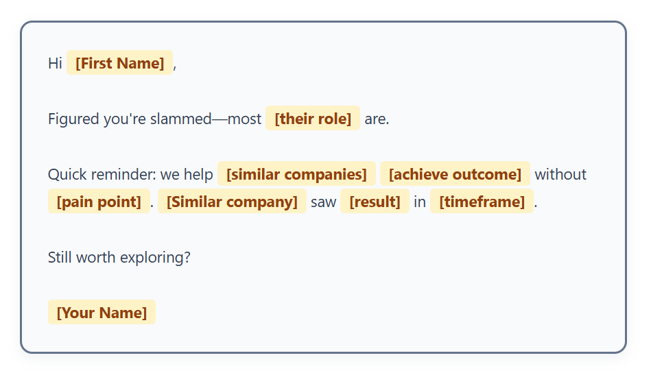 Don't just say "following up" and resend the same message. That's lazy and annoying. Instead, following b2b cold email best practices means giving them a reason to reply: