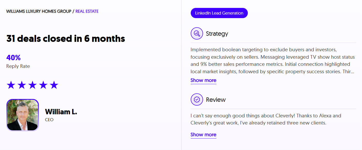 Cleverly is the highest-rated, 100% done-for-you B2B lead generation agency, and we've helped 10,000+ clients generate leads with companies like Amazon, Google, Uber, PayPal, Slack, and Spotify, resulting in $312 million in pipeline revenue and $51.2 million in closed revenue.
