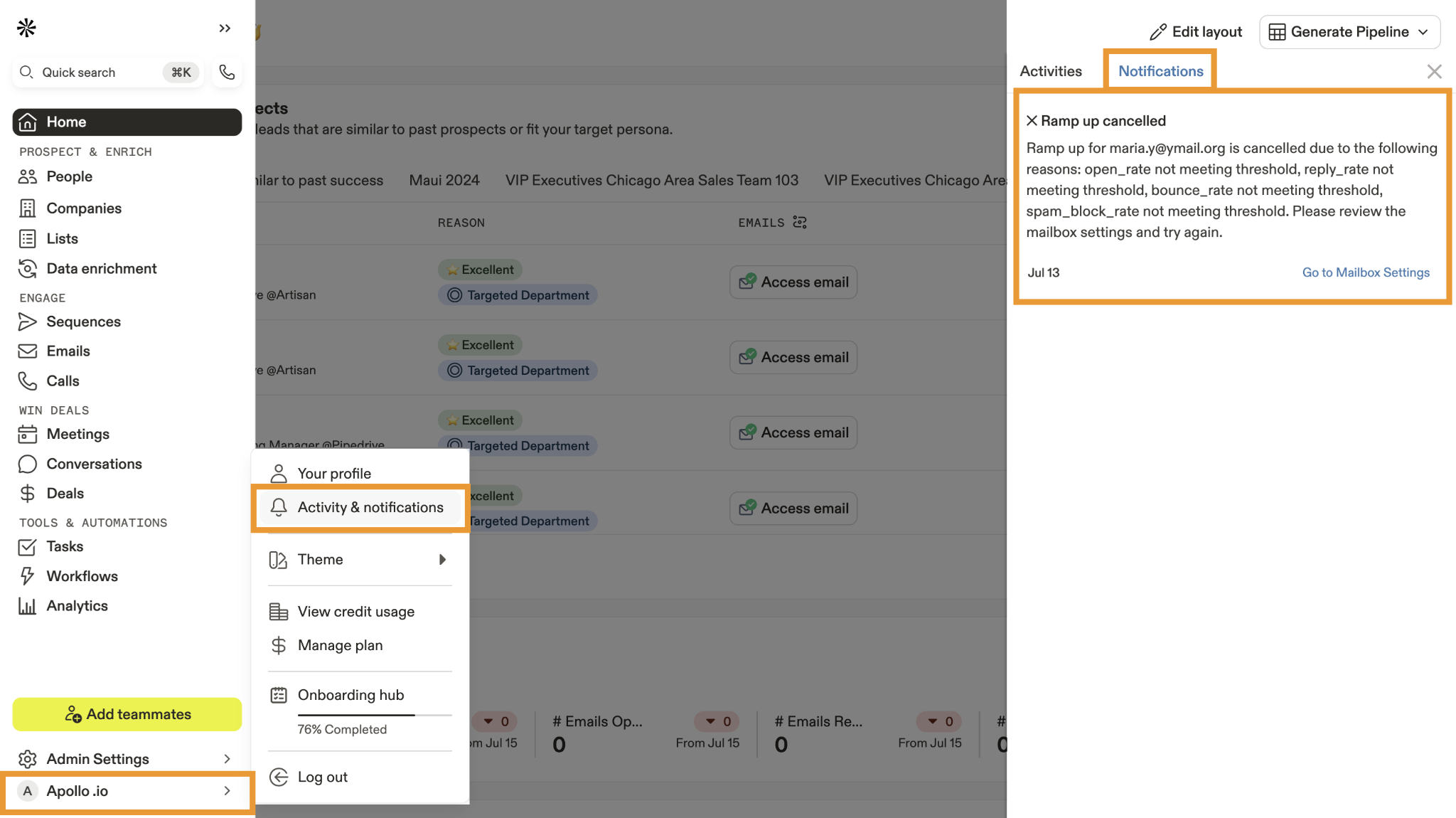 Apollo has deliverability tools, but they're not the core product. The platform runs on shared sending infrastructure — your emails go out alongside thousands of other Apollo users. If other senders on that infrastructure have poor list hygiene, it creates risk that flows into your campaigns. Apollo added built-in email warmup in recent updates, but it requires more hands-on management than Instantly's set-and-forget approach.