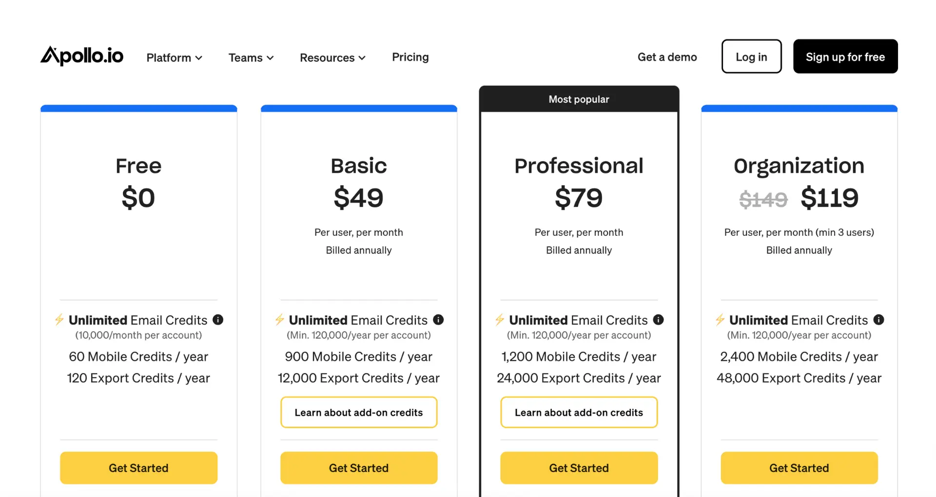 Apollo.io offers four plans: Free, Basic ($49/user/month annual), Professional ($79/user/month annual), and Organization ($119/user/month annual), with monthly billing adding 15–25% to each tier.