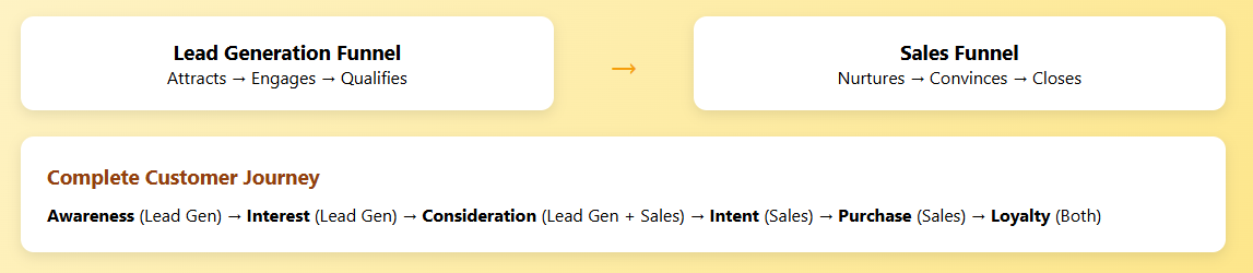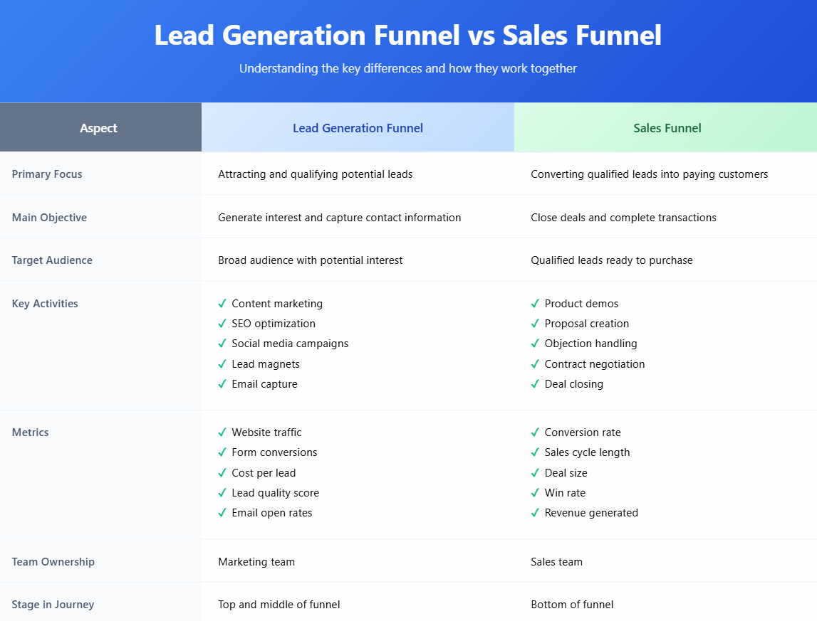 While a lead generation funnel vs. sales funnel comparison highlights their differences, the truth is they work best when used together.