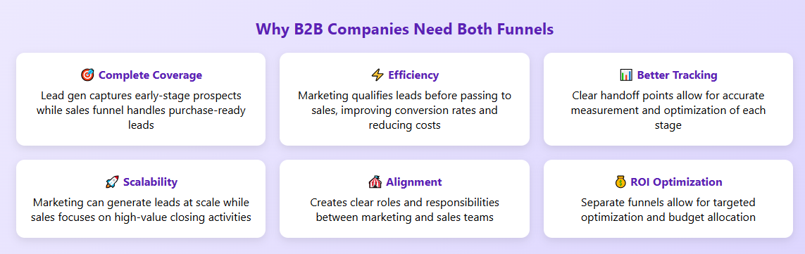 For B2B companies, having both is non-negotiable. Without a lead generation funnel, your sales team doesn’t have a steady flow of qualified leads to work with.