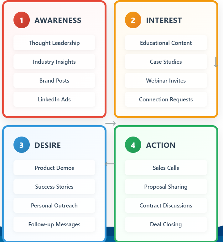 - Awareness: Outreach to founders and CMOs on LinkedIn → Run content ads promoting a guide on scaling outbound.