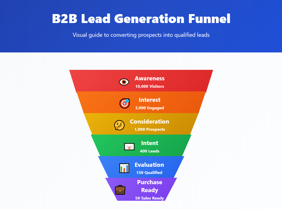 Think of your B2B lead generation funnel as the backbone of your marketing and sales process. It ensures no lead slips through the cracks, every touchpoint is intentional, and prospects get exactly what they need to move forward.