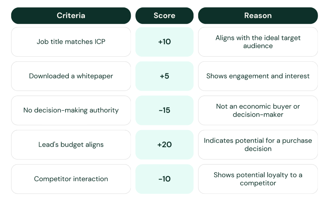 Example: If you run a marketing automation tool, a VP of Marketing from a 500-person SaaS company who downloaded your whitepaper is a much stronger lead than a junior marketer from a 5-person startup.
