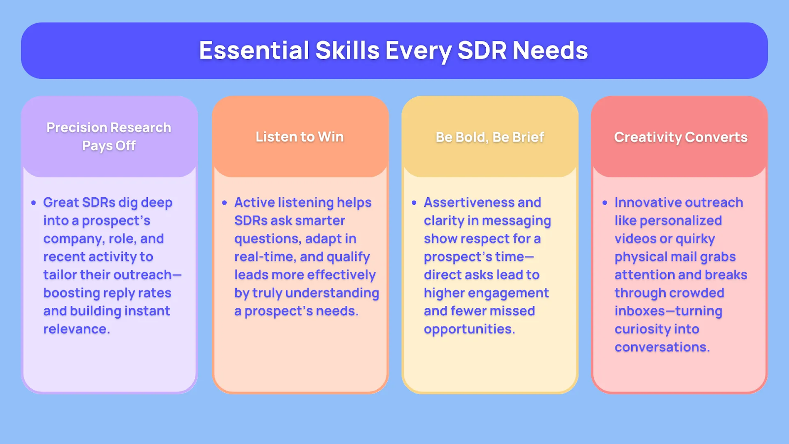 - The best SDRs combine strong communication skills, resilience to handle rejection, disciplined follow-up habits, and proficiency with sales tools.