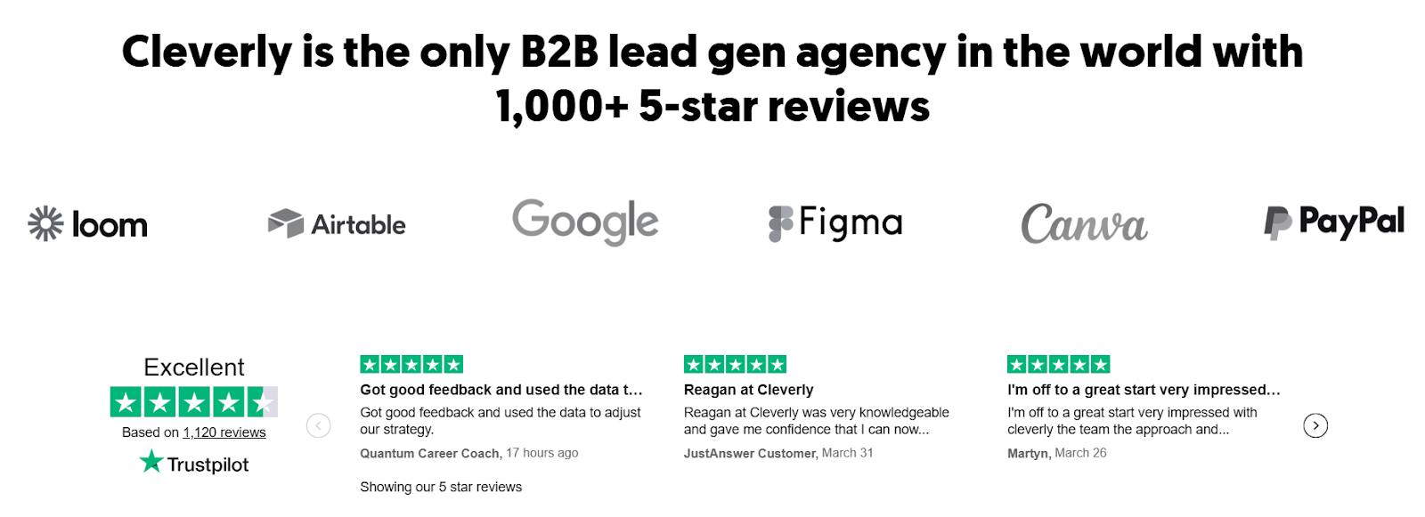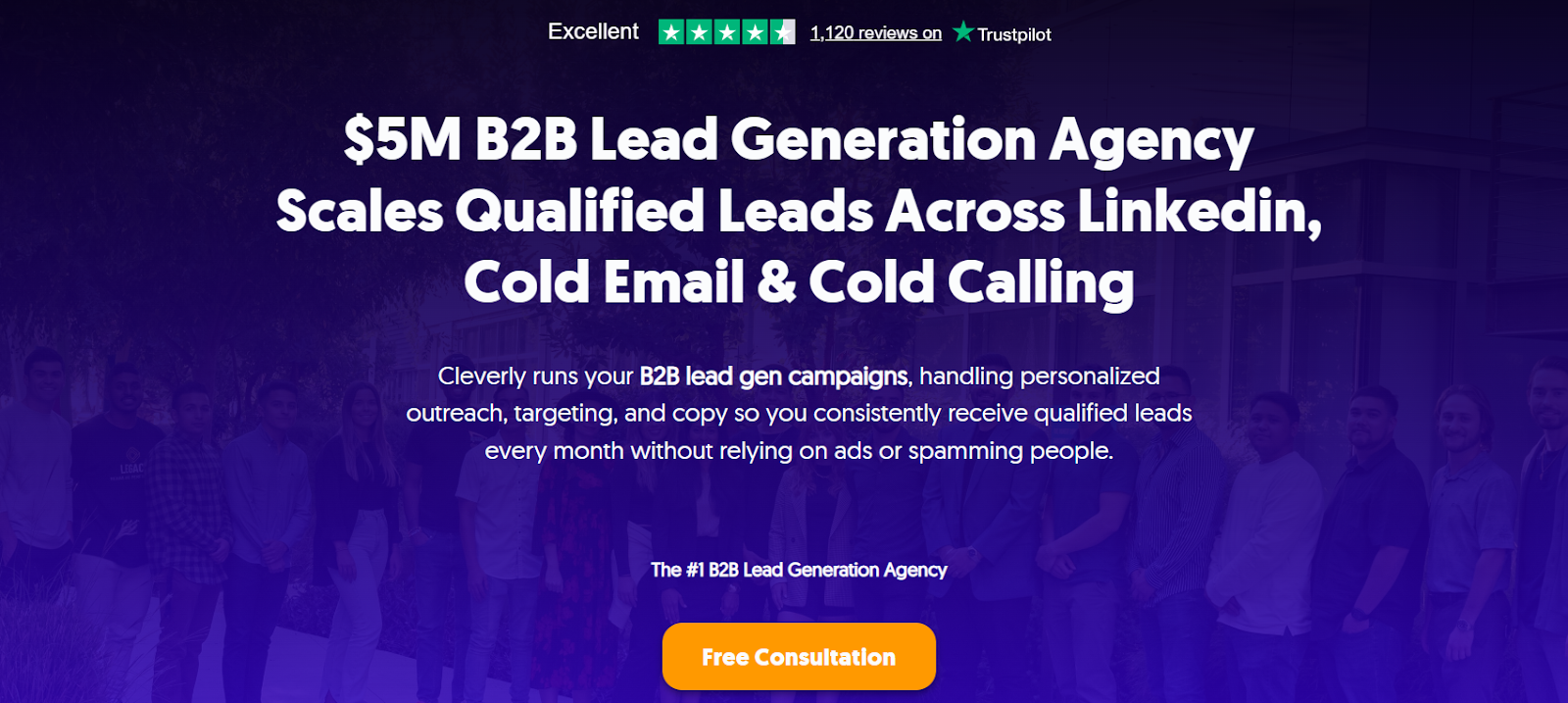 - 1,000+ five-star reviews across G2, Clutch, and Trustpilot — the highest-rated B2B lead gen agency.