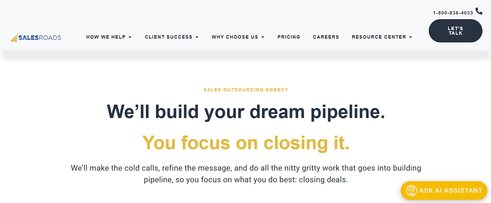 SalesRoads is a US-based B2B appointment setting and outbound lead generation company founded in 2007. They serve mid-market and enterprise clients with a high-touch, fully customized approach that prioritizes conversation quality over volume. Their SDR team has an average of 5 to 10 years of experience, and each client gets a dedicated SDR, a sales coach, and a director of client success.