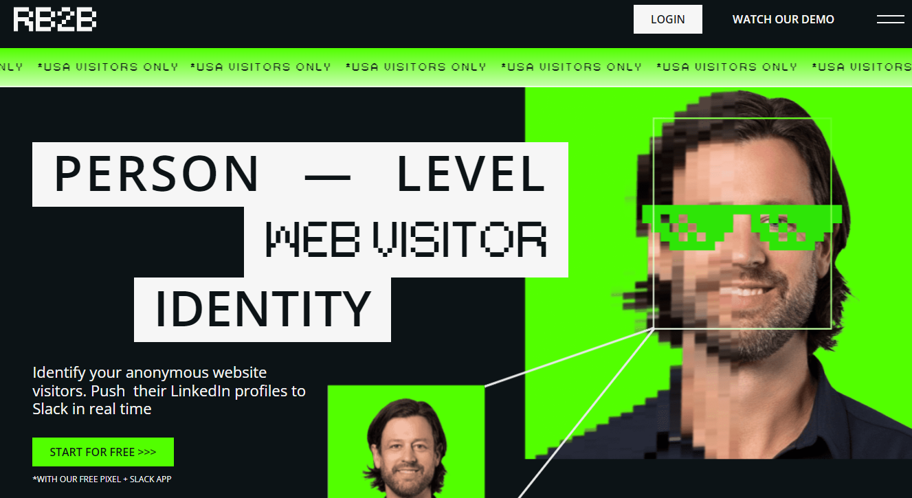 RB2B is the go-to tool for SDR teams that need individual contact data from website traffic, not just company names. Install a JavaScript pixel and within minutes, identified visitors start flowing into your Slack — complete with name, company, job title, LinkedIn profile, and the pages they viewed.